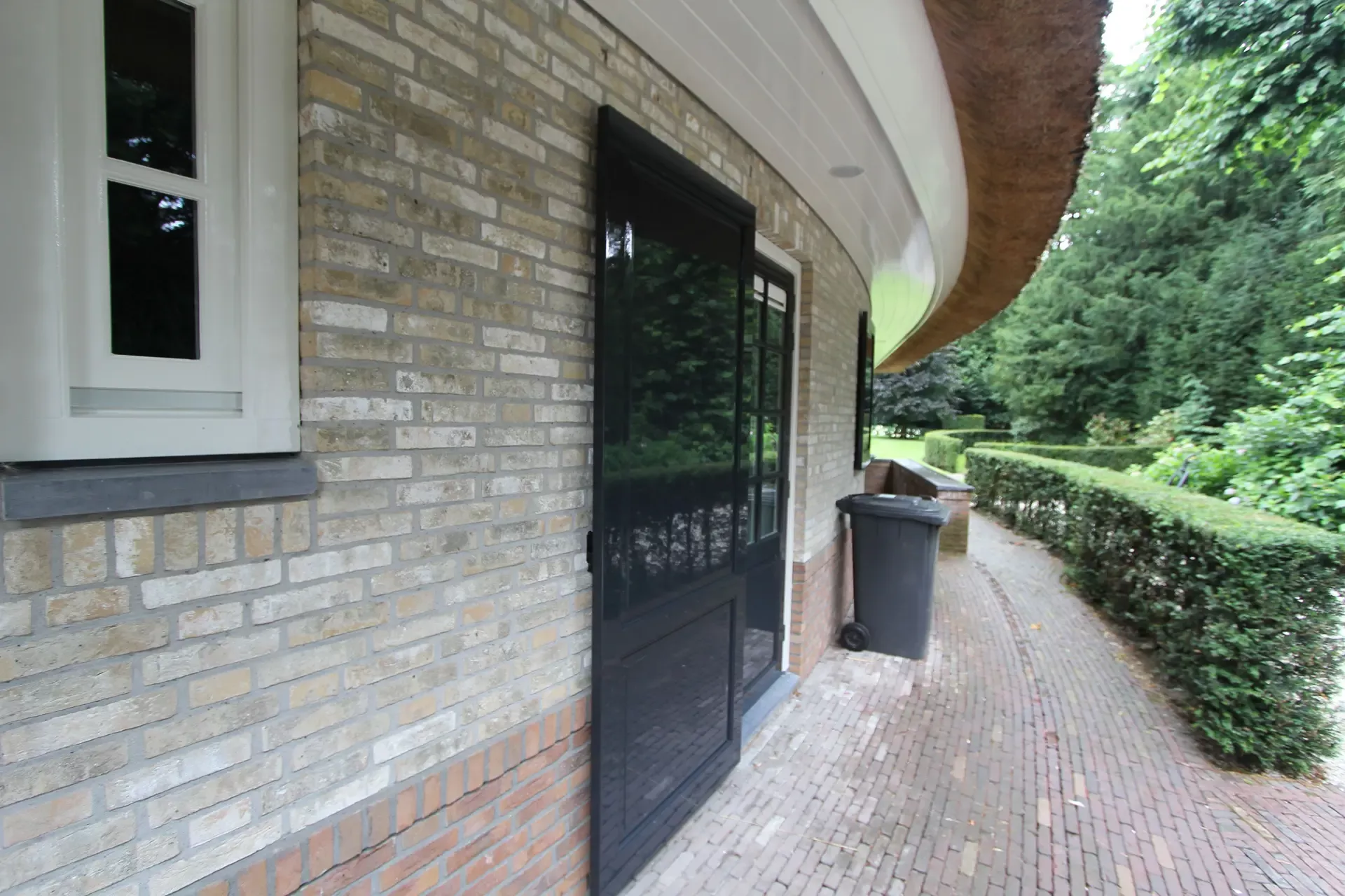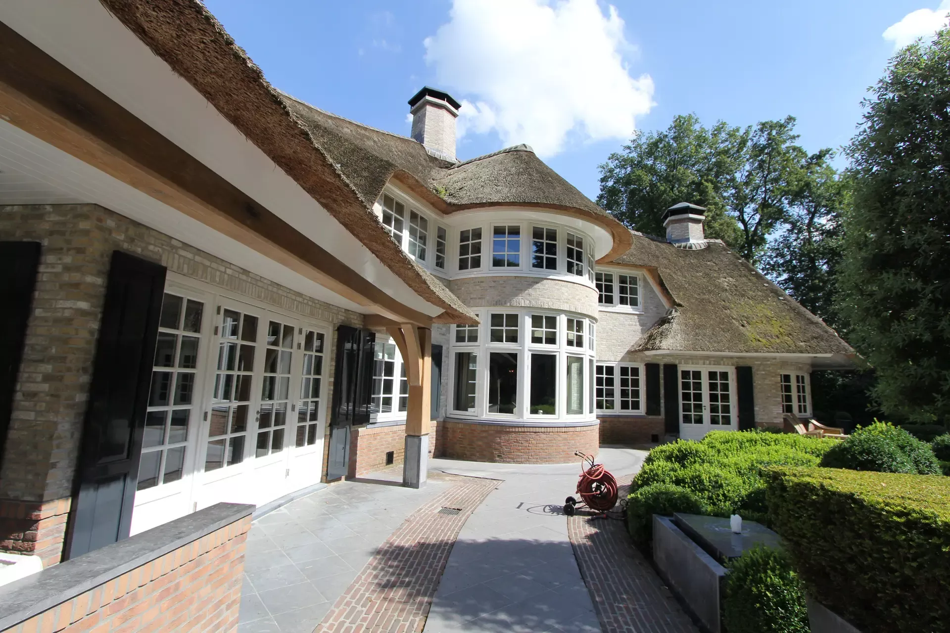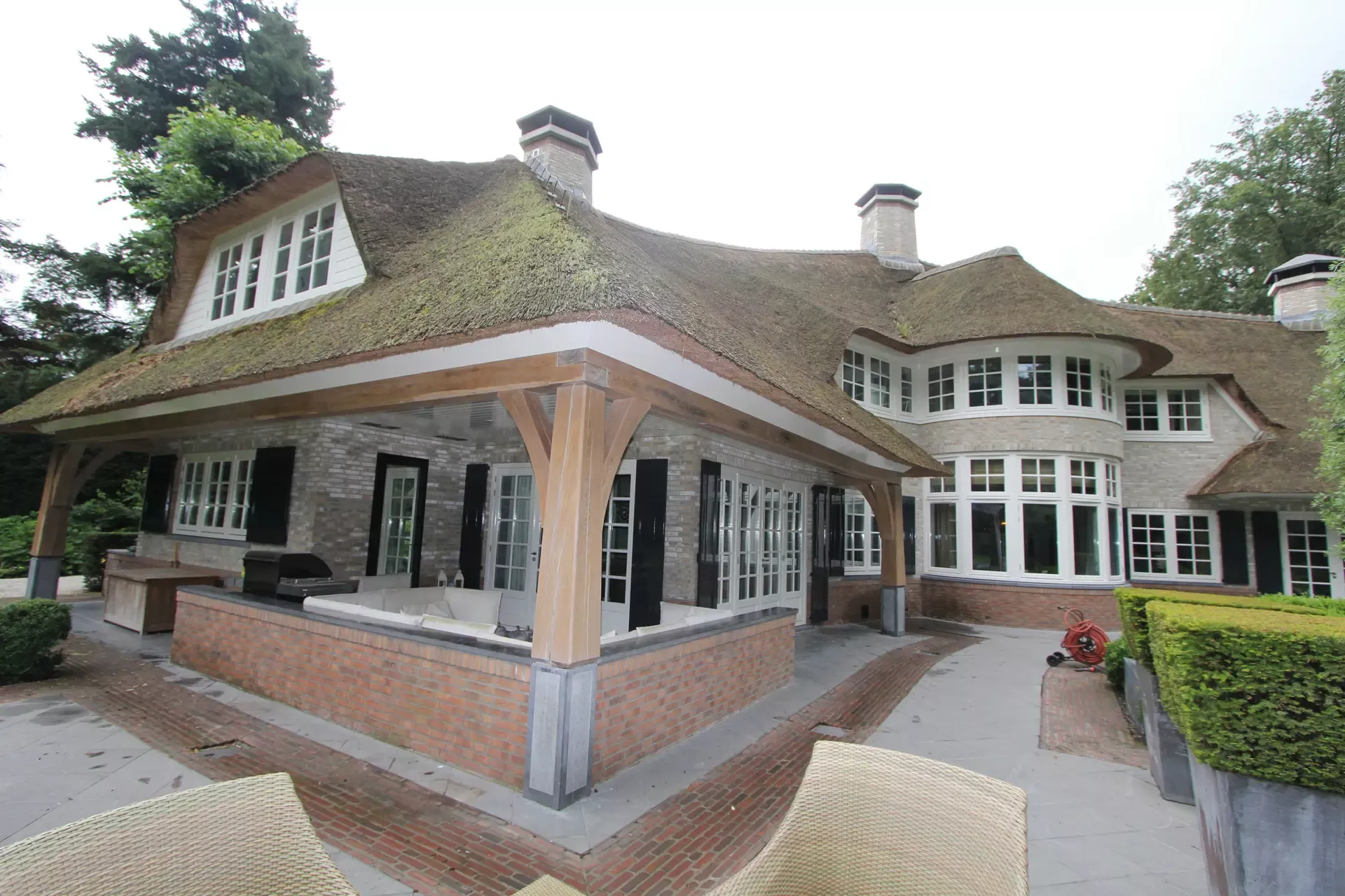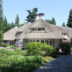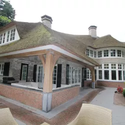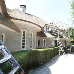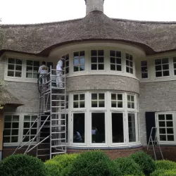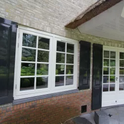 Na 10 jaar sinds de nieuwbouw was deze prachtige villa in Blaricum toe aan een grondige schilderbeurt. We hebben al het houtwerk aan de buitenzijde gecontroleerd op lekke naden en kieren, en waar nodig opnieuw gekit of gerepareerd met epoxy. Vervolgens hebben we het houtwerk voorzien van twee nieuwe lagen hoogglansverf en de kleur aangepast aan de hedendaagse trends.