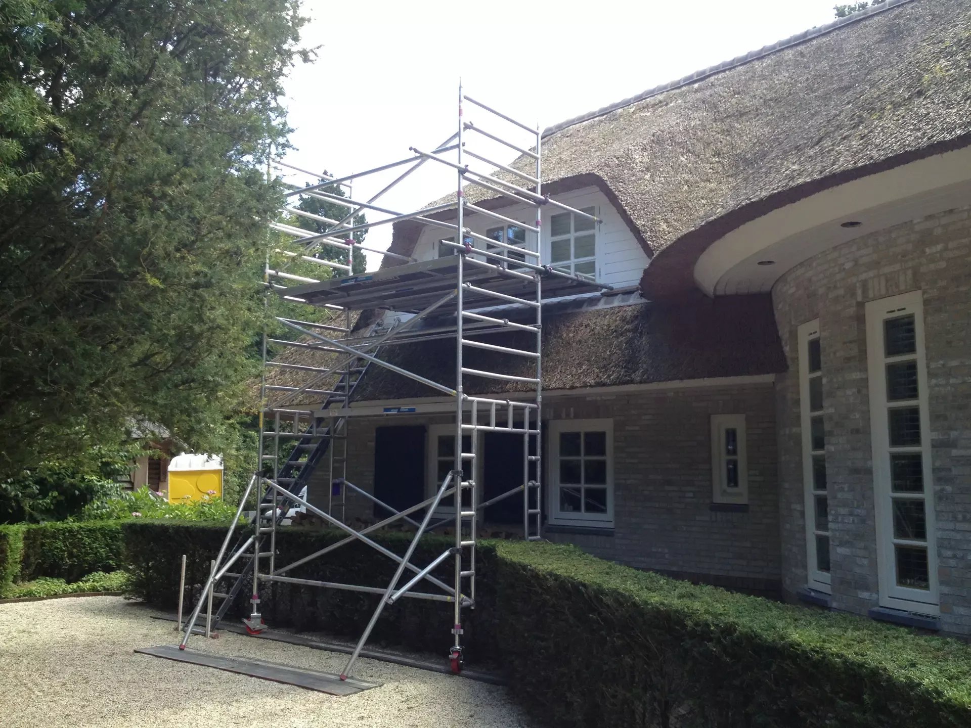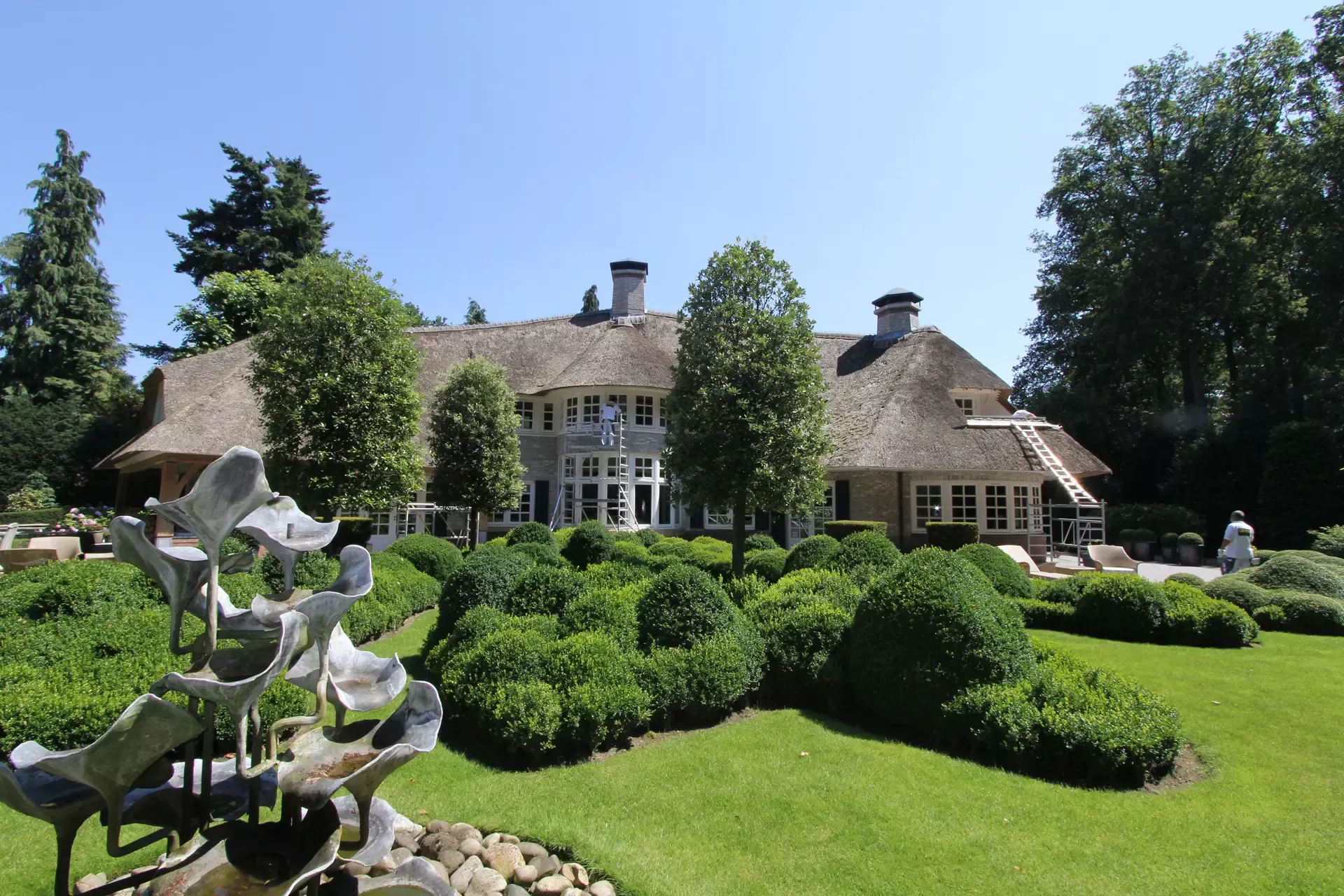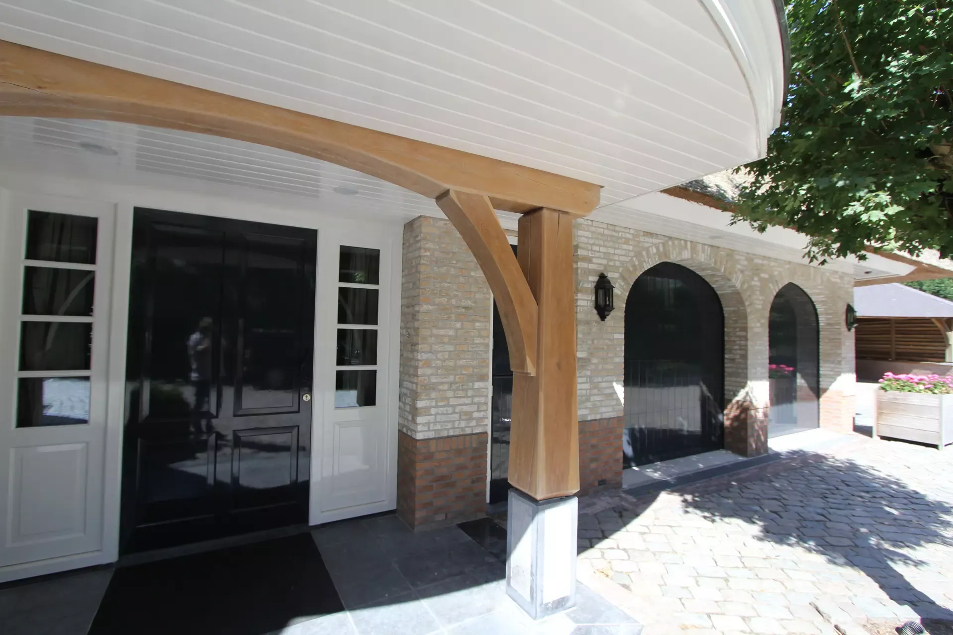 Na 10 jaar sinds de nieuwbouw was deze prachtige villa in Blaricum toe aan een grondige schilderbeurt. We hebben al het houtwerk aan de buitenzijde gecontroleerd op lekke naden en kieren, en waar nodig opnieuw gekit of gerepareerd met epoxy. Vervolgens hebben we het houtwerk voorzien van twee nieuwe lagen hoogglansverf en de kleur aangepast aan de hedendaagse trends.