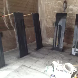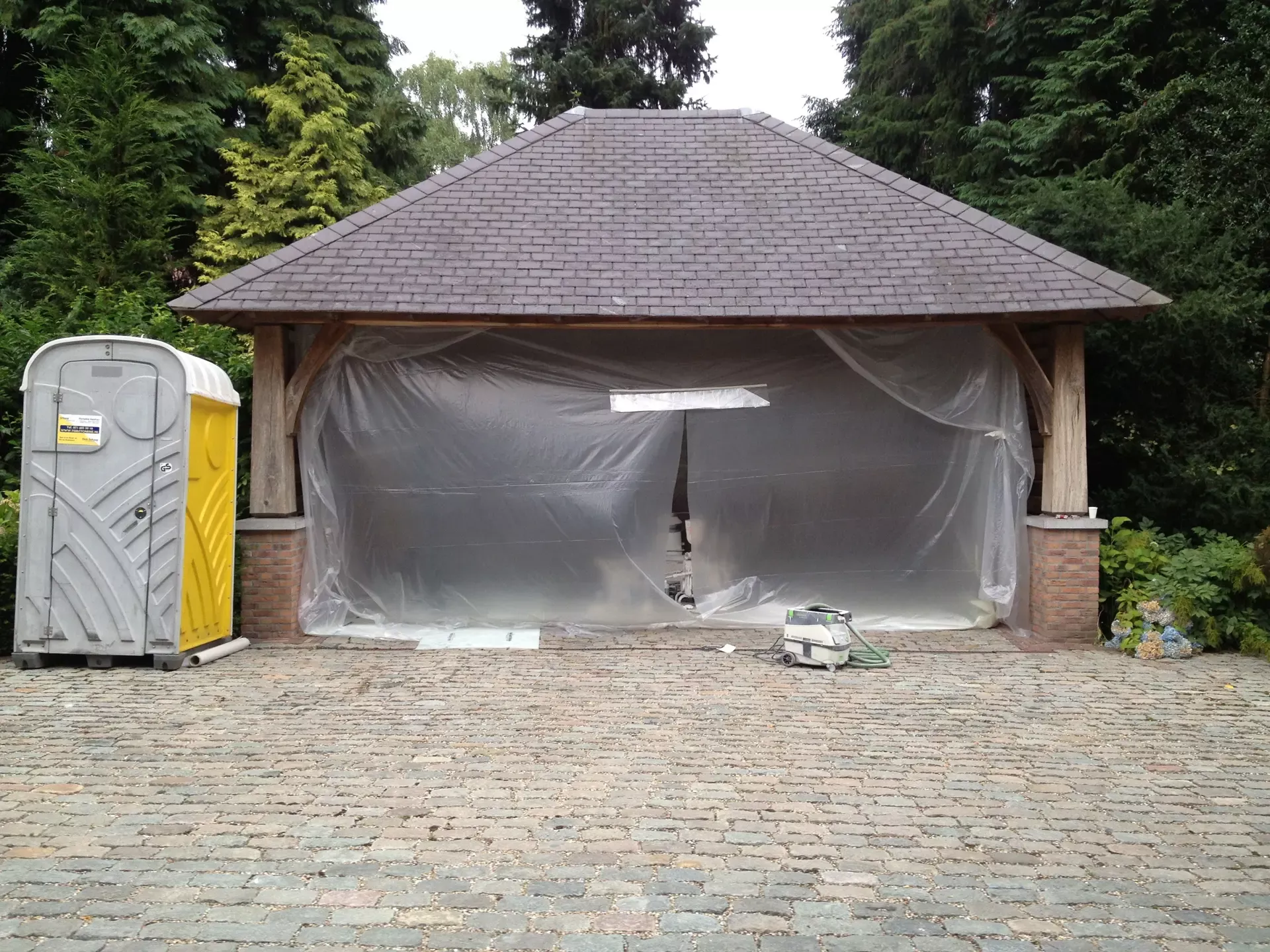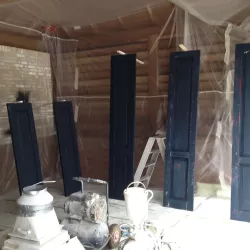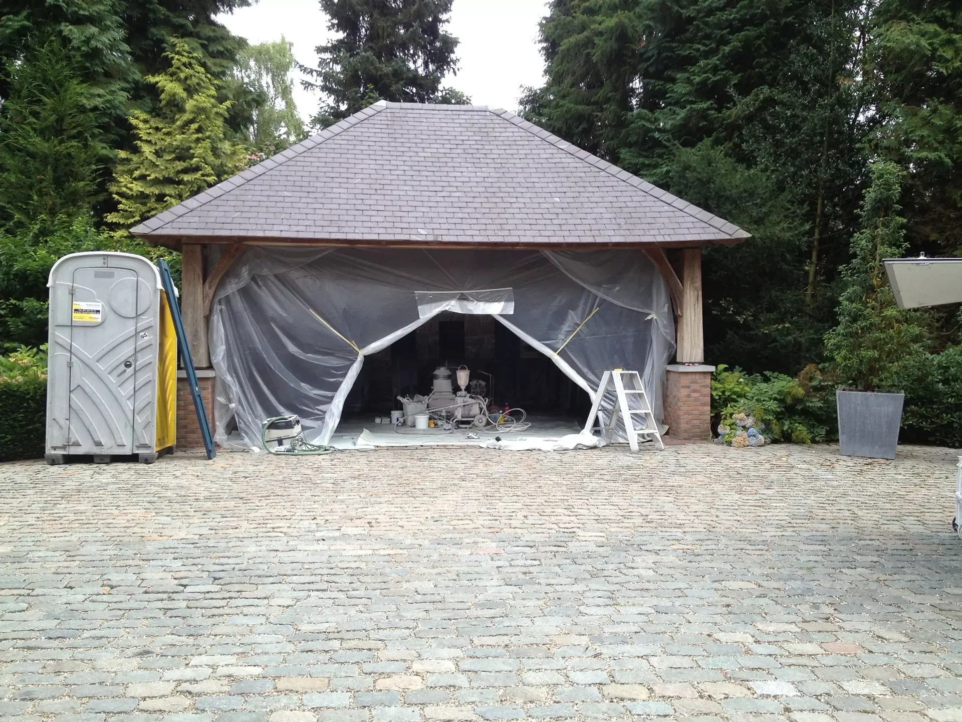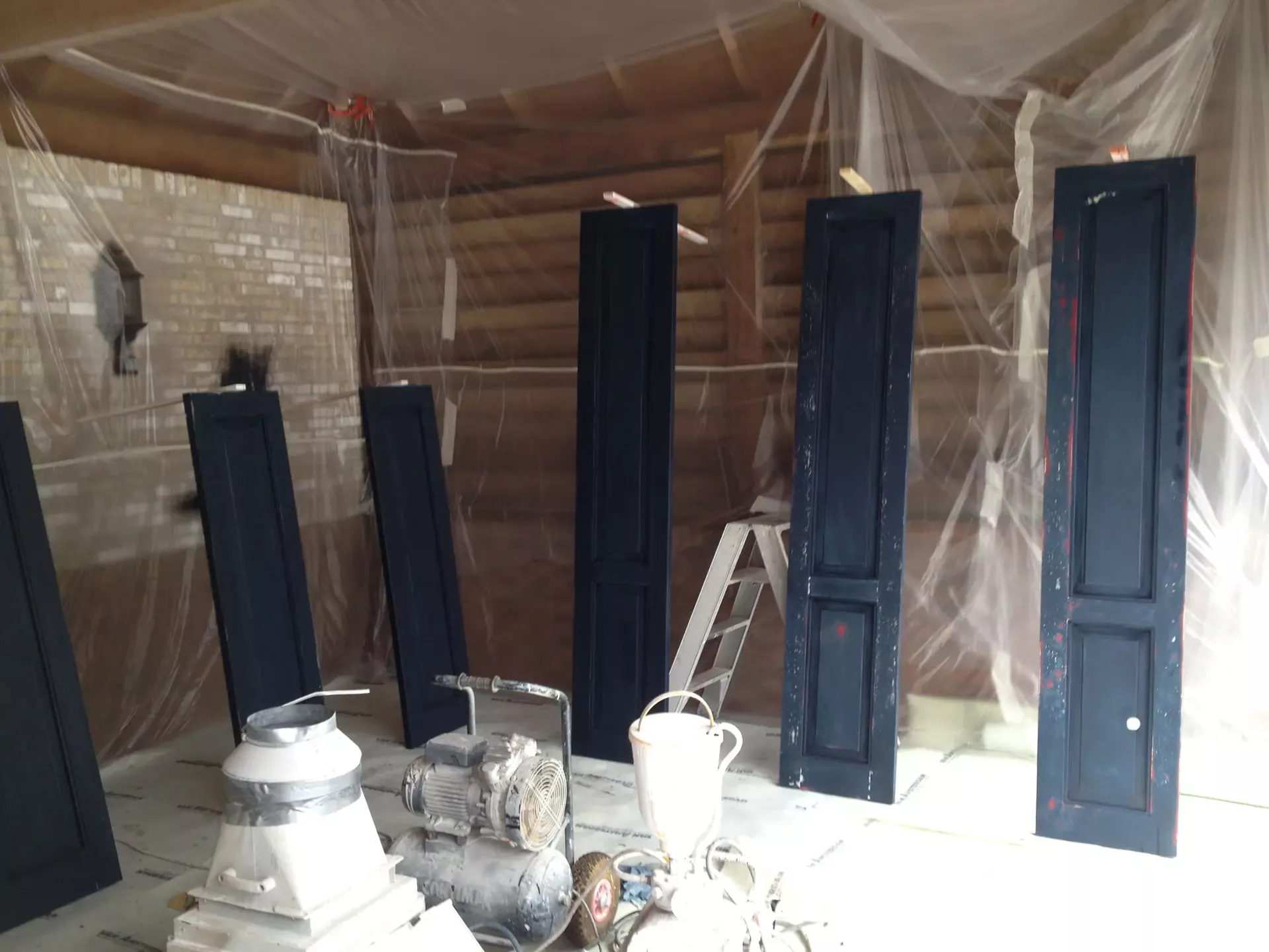 Voor de carport hebben we een tijdelijke spuitcabine ingericht om de luiken te spuiten, terwijl de rest van het houtwerk met de hand is geschilderd. Binnen hebben we alle oppervlakken gespoten voor een uniforme en strakke afwerking.